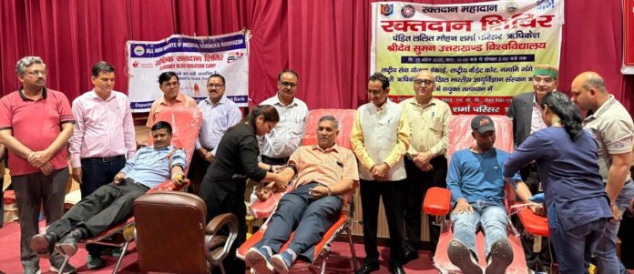 ऋषिकेश ( राव शहजाद ) । पंडित ललित मोहन शर्मा श्रीदेव सुमन उत्तराखंड विश्वविद्यालय परिसर ऋषिकेश में राष्ट्रीय सेवा योजना इकाई,राष्ट्रीय कैडेट कोर, नमामि गंगे प्रकोष्ठ, एम एल टी,रोटरी ऋषिकेश सेंट्रल एवं अखिल भारतीय आयुर्विज्ञान संस्थान ऋषिकेश के सयुक्त तत्वाधान मे स्वैच्छिक रक्तदान शिविर का आयोजन किया गया I जिसमें छात्र छात्राओं ने बढ़-चढ़कर प्रतिभाग किया । परिसर में रक्तदान के लिए छात्रों की लंबी कतारें देखी जिसमें 95 यूनिट रक्त एकत्रित किया गया । रक्तदान शिविर का उद्घाटन देव सुमन उत्तराखंड विश्वविद्यालय परिसर के कुलपति प्रो एनके जोशी , परिसर के निदेशक प्रो महावीर सिंह रावत , विज्ञान संकाय अध्यक्ष प्रो गुलशन कुमार ढींगरा ने द्वारा किया। एनए एस कोऑर्डिनेटर प्रो गौरव वासने कार्यक्रम के संयोजक एवं राष्ट्रीय सेवा योजना के वरिष्ठ कार्यक्रम अधिकारी डॉ अशोक कुमार मेंदोला संयोजक प्रो धर्मेन्द्र तिवारी डॉ पारूल मिश्रा उपस्थित रहे । कुलपति प्रो एन के जोशी ने कहा कि रक्तदान करने से दिल की सेहत में सुधार दिल की बीमारियां और स्ट्रोक का खतरा कम हो जाता है खून में आयरन की ज्यादा मात्रा दिल के दौरे के खतरे को बढ़ा सकती है नियमित रूप से रक्तदान करने से आयरन की अतिरिक्त मात्रा नियंत्रित हो जाती है जो दिल की सेहत के लिए अच्छा है, हमारे देश में ब्लड डोनेशन करने वालों की संख्या कम एवं ब्लड की मांग ज्यादा है क्योंकि कई मरीजों के शरीर में खून की मात्रा इतनी कम हो जाती है उन्हें किसी और व्यक्ति से ब्लड लेने की आवश्यकता पड़ जाती है, ऐसी इमरजेंसी स्थिति में खून की आपूर्ति के लिए लोगों को रक्तदान करने के लिए आगे आना चाहिए जिससे जरूरतमंद की मदद हो सकेगी I