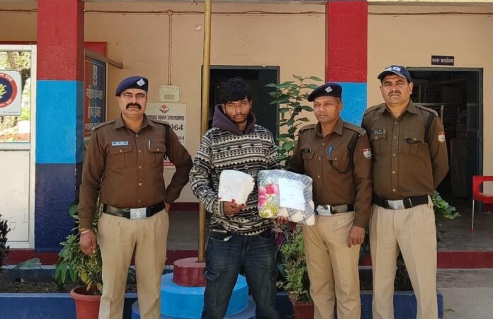 बता दे पुलिस द्वारा गठित की गई टीम द्वारा रात्रि में घटनास्थल के आसपास घूम रहे सभी संदिग्धों से पूछताछ व सीसीटीवी कैमरे चेक करते हुए संदिग्धों पर निगरानी रखते हुए मुखबिर से प्राप्त सूचना पर 15 फरवरी की रात्रि गीता भवन नंबर 1 के घाट से अजीत उरांव पुत्र बसु उराव निवासी ग्राम जनआ पोस्ट जनआ थाना गुमला जिला गुमला झारखंड उम्र 21 वर्ष को चोरी के समान , दुर्गा जी की मूर्ति एक पीली धातु , लक्ष्मी नारायण जी की संयुक्त मूर्ति पीली धातु की , दो मुकुट सफेद धातु के , गणेश जी की मूर्ति पीली धातु की , अंबिका जी की मूर्ति पीली धात की , गिरिराज जी की मूर्ति पीली धात एक कंबल के साथ गिरफ्तार किया गया । वही अजीत उरांव को आवश्यक कार्रवाई के पश्चात माननीय न्यायालय पौड़ी में पेश किया गया। पुलिस टीम में उप निरीक्षक हेमकांत सेमवाल ,अपर उप निरीक्षक राहुल ठाकुर , कॉन्स्टेबल चंद्रपाल सिंह , कांस्टेबल चंद्रशेखर , कांस्टेबल सतपाल शामिल थे ।