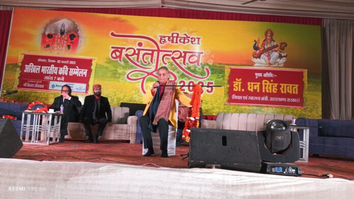महान कवि हरिओम पंवार जी ने सुनाया, पैरों में अंगारे बांधे,सीने में तूफान भरे, नई धरती परमाणु हथियारों से सजी है। मैं मेंहदी पायल कंगन के गीत भी गाता हूं, मैं धरती से आतंकवाद का निपटारा गाता हूं, खूनी पंजों के हाथों में देश दिखाई देता है, और कहा कि मैंने कभी भगवान तो नहीं देखे लेकिन सीमा पर हमारी रक्षा करने वाले हर फौजी हमारे भगवान है। इस अवसर पर बसंतोत्सव मेला समिति ने डॉ हरिओम पंवार, संपत सरल, शंभू शिखर, जानी बैरागी, डॉ राजीव राज, सपना सोनी, विनोद पाल सभी का हार्दिक आभार व्यक्त किया। मौके पर कवि सम्मेलन में महंत वत्सल पर प्रपन्नाचार्य महाराज, हर्षवर्धन शर्मा, संयोजक दीप शर्मा, सहसंयोजक वरुण शर्मा, सचिव विनय उनियाल, जयेंद्र रमोला, प्रधानाचार्य यमुना प्रसाद त्रिपाठी, प्रधानाचार्य के एल दीक्षित, एडवोकेट राकेश सिंह, महंत रवि शास्त्री, रामकृपाल गौतम, अशोक अग्रवाल, चंद्रशेखर शर्मा, सुरेंद्र दत्त भट्ट, लेफ्टिनेंट लखविंदर सिंह, डॉ सुनील दत्त थपलियाल, रंजन अंथवाल सहित अन्य मौजूद रहे।