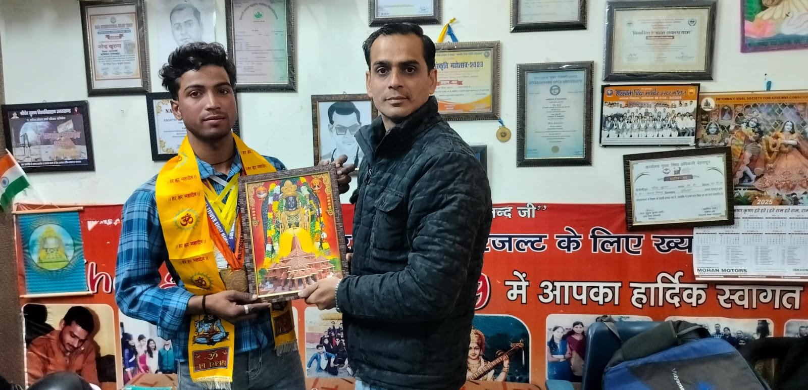 ऋषिकेश । काली कमली निवासी गीता नगर के रोशन राजभर पुत्र राधेश्याम राजभर ऋषिकेश व पुष्पा बडेरा विद्या मंदिर में कक्षा 12 में अध्ययनरत को शिक्षक नरेन्द्र खुराना ने अपने निवास पर बुलाकर 21 मेडल से अधिक प्राप्त करने वाले खेल ,दौड़ शिक्षा एवं खो खो , कराटे में उत्कृष्ट प्रदर्शन करने वाले युवा रोशन को शिक्षक नरेंद्र खुराना सरस्वती विद्या मंदिर इंटर कॉलेज आवास विकास के मीडिया प्रभारी व समाजसेवी साथ ही अनेकों सम्मानों से सम्मानित नरेंद्र खुराना ने रोशन राजभर को पटका पहनाकर व प्रभु श्री राम का चित्र देकर उत्साहवर्धन किया । रोशन ने बताया कि उत्तराखंड एमेच्योर किकबॉक्सिंग एसोसिएशन में प्रथम स्थान गोल्ड मेडल व 6 वी उत्तर भारत कराटे चैंपियनशिप 2024 में प्रथम स्थान गोल्ड मेडल एवं U -19कराटे चैंपियनशिप द्वितीय स्थान सिल्वर मेडल प्राप्त कर चुके है,उनको गुरु के द्वारा सम्मानित होना सौभाग्य का विषय है । इस पर नरेंद्र का कहना है कि आज का ऐसे युवा को आगे आना चाहिए हमारे युवा प्रेरणा स्त्रोत हैं।