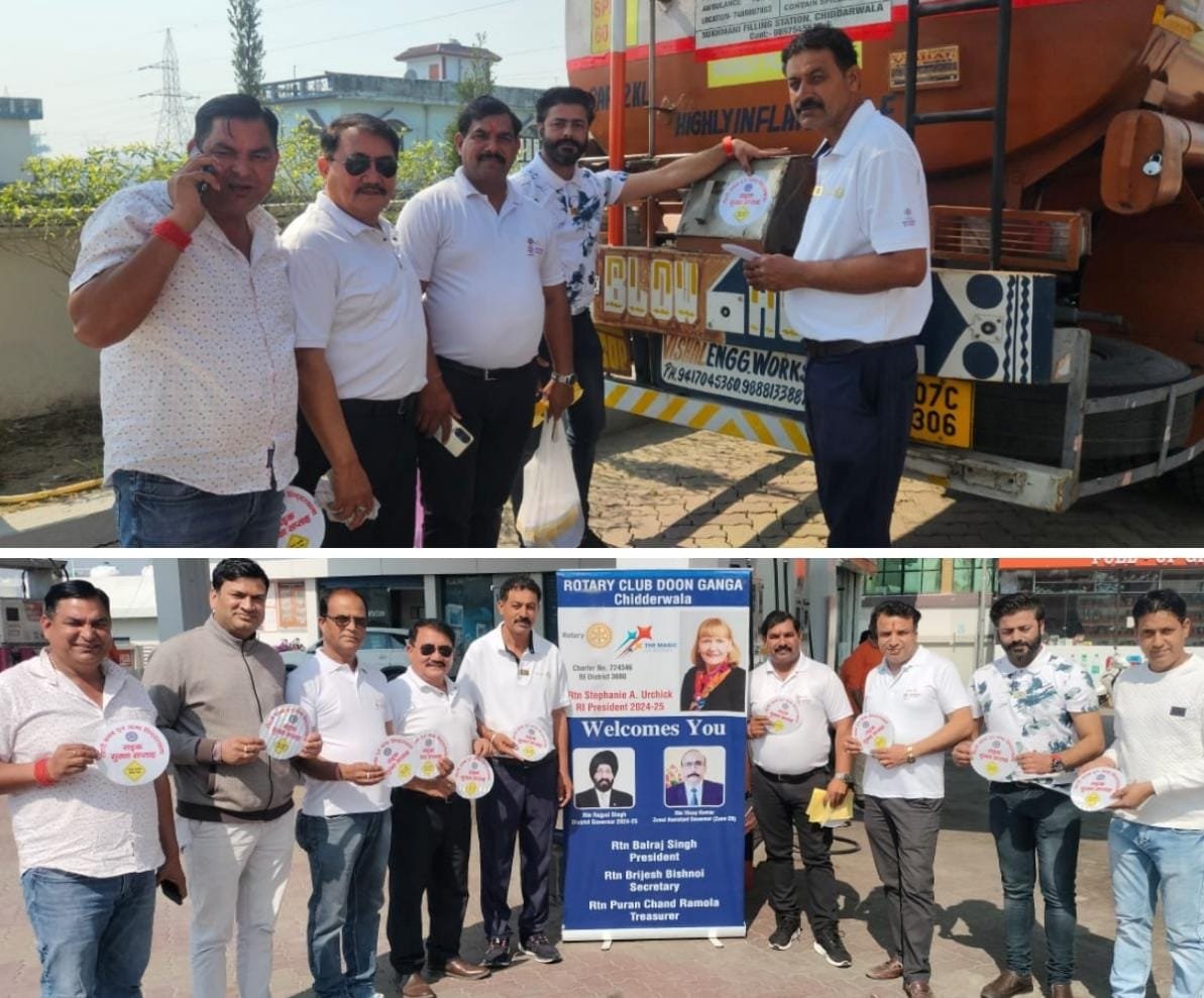 रायवाला ( राव शहजाद ) । रोटरी क्लब दून गंगा छिद्रवाला ने सड़क सुरक्षा के तहत लोगो को जागरूक किया है। सोमवार को छिद्रवाला चौक पर अभियान चलाकर क्लब सदस्यों ने आमजन को सड़क सुरक्षा के लिए लोगों को जानकारी दी है । इस अवसर पर सदस्यों ने सड़क सुरक्षा के तहत लोगो की गाड़ियों पर रेडियम स्टीकर भी लगाए गए।इसके अलावा क्लब द्वारा एक विकलांग व्यक्ति को व्हील चेयर भी दी गई। इन कार्यक्रम में रोटरी क्लब के काफी रोटेरियन उपस्थित थे व्हील चेयर रोटेरियन गौरव और मोहन सिंह रावत द्वारा की गई । क्लब अध्यक्ष बलराज सिंह एवं सचिव बृजेश बिश्नोई ने बताया की क्लब द्वारा समय समय पर समाज के हित के लिए कार्य किए जाते है । जो कि आगे भी जारी रहेंगे ।