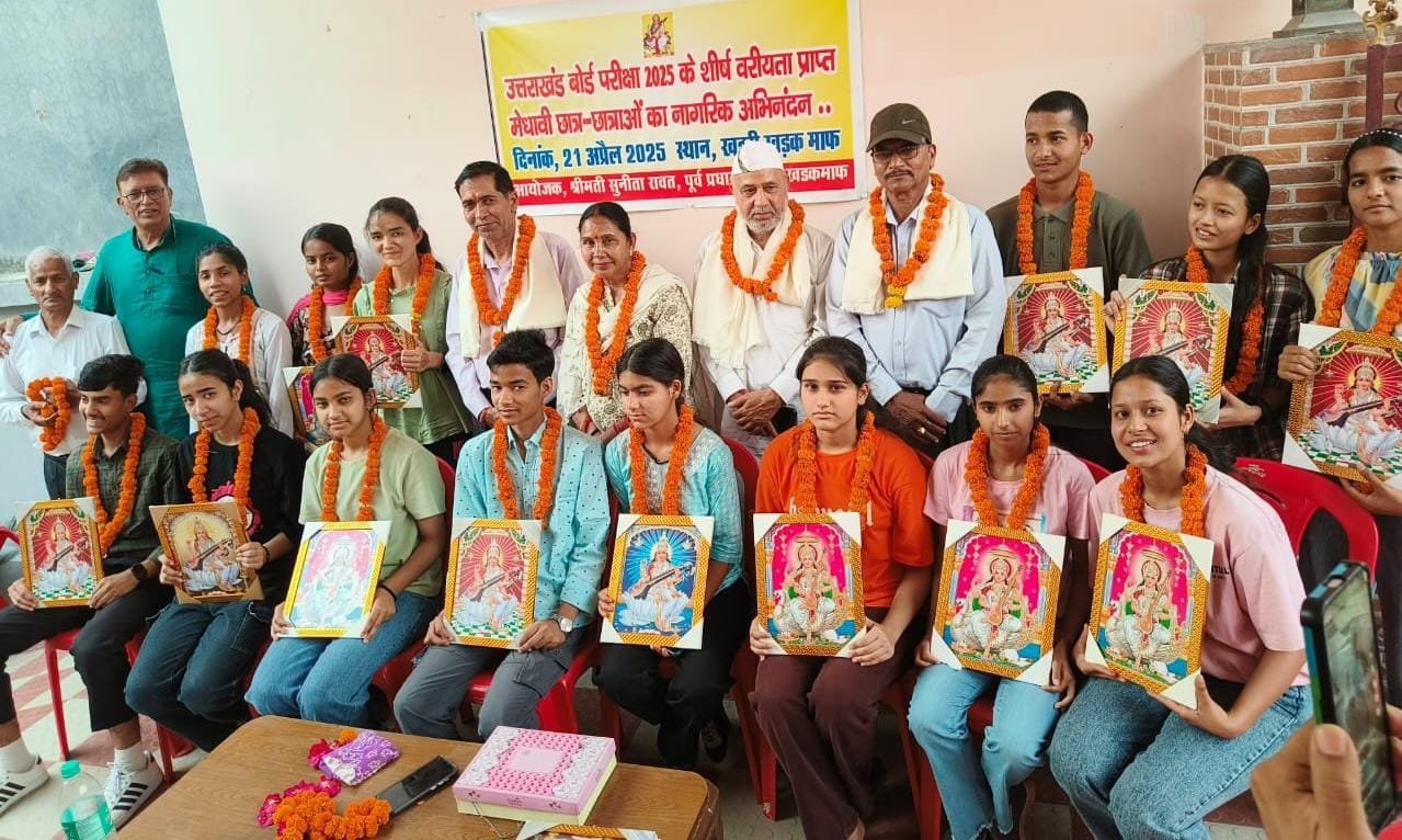 ऋषिकेश ( राव शहजाद ) । उत्तराखंड बोर्ड परीक्षा 2025 के शीर्ष वरीयता प्राप्त स्थानीय छात्र-छात्राओं का नागरिक अभिनंदन कर सम्मानित किया गया । इस अवसर पर कक्षा 10 के प्रतिभाशाली छात्र-छात्राएं जिनमे मोनिका नेगी 96.8 %, अर्जुन बिष्ट 96%, कनिष्कl 95.6%, अर्पित गुनसोला 94.4%, प्रिंस देवल 94.4%, सौरभ पुंडीर 94.6%, शुभम नेगी 94.2%, सोनाली बिष्ट 93%, भावना बिंजोला 92.8% एवं कक्षा 12 के प्रतिभाशाली छात्र-छात्राएं साहिल चौहान 91%, हिमानी भट्ट 94.4%, ज्योति 92.8%, अनुसरण 91%, साक्षी पुंडीर 90.6%, आयुषी नवानी85%, किरण कुशवाहा 84%, सेजल कश्यप 85% आदि हॉनर छात्र-छात्राओं को सम्मानित किया गया। कार्यक्रम संयोजक खदरी खड़क माफ की पूर्व प्रधान सुनीता रावत ने शीर्ष वरीयता प्राप्त स्थानीय छात्र-छात्राओं को प्रतीक चिन्ह भेंट कर उनके गुरुजनों एवं परिजनों को शॉल ओढ़ाकर सम्मानित कर नागरिक अभिनंदन किया । पूर्व प्रधान ने कहा कि मेधावी छात्र-छात्राओं को सम्मानित कर स्वयं भी गौरवनित महसूस करती है l, उन्होंने नालंदा शिक्षण संस्थान, के प्रबंधक गुरु महावीर प्रसाद उपाध्याय, विवेक एकेडमी के प्रबंधक गुरु गजेंद्र रियाल ,एवं शिवालिक भागीरथी पब्लिक स्कूल के प्रबंधक गुरु लक्ष्मण सिंह चौहान जी को सम्मानित करते हुए कहा कि उनके अथक प्रयासों के चलते खदरी खड़क माफ एजुकेशनल हब बन गया है l